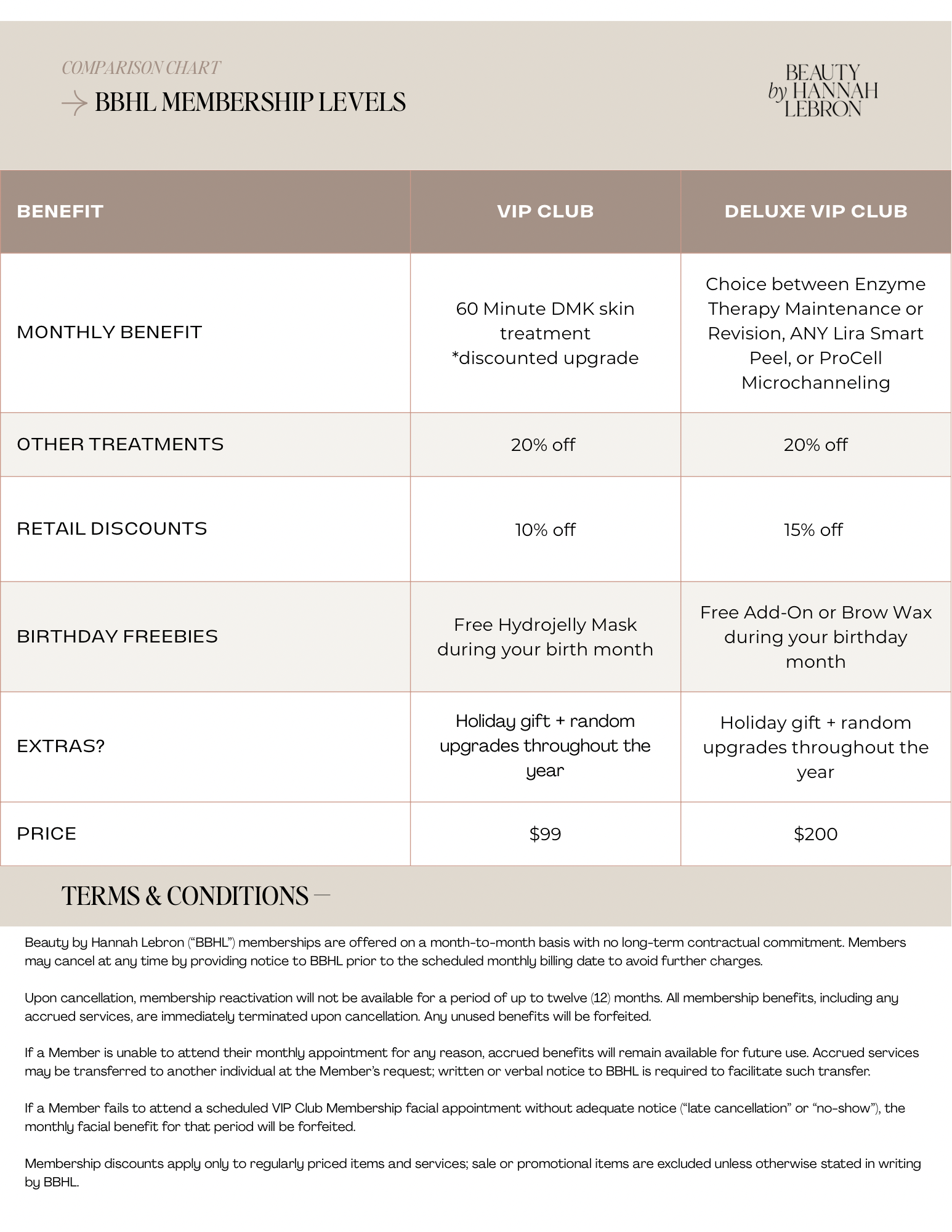 Beauty by Hannah Lebron (“BBHL”) memberships are offered on a month-to-month basis with no long-term contractual commitment. Members may cancel at any time by providing notice to BBHL prior to the scheduled monthly billing date to avoid further charges.